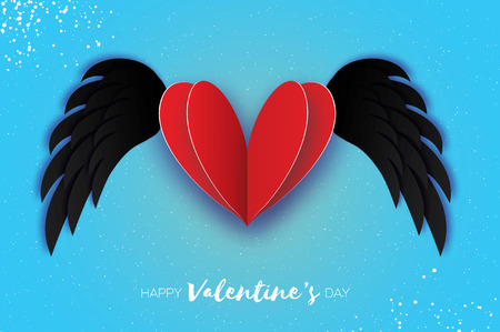幸せなバレンタインデーのグリーティング カード 折り紙かわいい天使の羽とロマンチックなピンクのハート 大好きです 紙の翼のあるハートのカット スタイル 青い空を背景 のイラスト素材 ベクタ Image